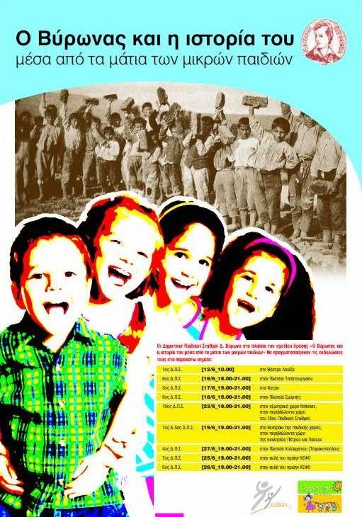 Οι μικροί μαθητές των Δημοτικών Παιδικών Σταθμών της πόλης μας, μας προσκαλούν σε μία «ξενάγηση» στον Βύρωνα και την ιστορία του μέσα από τη δική τους ματιά. «Ο Βύρωνας και η ιστορία του μέσα από τα μάτια των μικρών παιδιών» είναι το θέμα με το οποίο ολοκληρώνεται το επιμορφωτικό πρόγραμμα που διοργανώνει η Διεύθυνση των Παιδικών Σταθμών του Δήμου Βύρωνα, στο πλαίσιο της συνεχούς επιμόρφωσης των παιδαγωγών. Το πρόγραμμα περιλαμβάνει 9 εκδηλώσεις σε διάφορα σημεία της πόλης, οι οποίες ξεκινούν αύριο και ολοκληρώνονται στις 27 Ιουνίου.