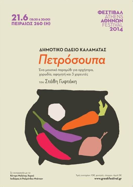 Το μουσικό παραμύθι «Πετρόσουπα» του Στάθη Γυφτάκη, παρουσιάζει το Σάββατο 21 Ιουνίου το Δημοτικό Ωδείο Καλαμάτας, σε συνεργασία με το Κέντρο Μελέτης Χορού «Ισιδώρας και Ραϋμόνδου Ντάνκαν» της πόλης μας, στο πλαίσιο του Φεστιβάλ Αθηνών και Επιδαύρου.