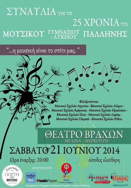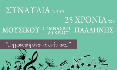 Πιο συγκεκριμένα, την ημέρα Ευρωπαϊκής Γιορτής της Μουσικής επέλεξε το Μουσικό Σχολείο Παλλήνης για να γιορτάσει μελωδικά τα 25 χρόνια λειτουργίας του. Έτσι, το Μουσικό Γυμνάσιο – Λύκειο Παλλήνης υποδέχεται, στις 21 Ιουνίου στις 8:00μ.μ., 8 μουσικά σχολεία από όλη την Ελλάδα (Αγρίνιο, ¶λιμος, ¶μφισσα, Ηράκλειο, Ίλιον, Λαμία, Πειραιάς, Ρόδος) σε μια μεγάλη γιορτή στο Θέατρο Βράχων, που θα πλημμυρίσει από τις μελωδίες και το ταλέντο των μαθητών.