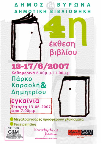 Σας περιμένουμε όλους στα εγκαίνια της Έκθεσης Βιβλίου του Δήμου Βύρωνα, την Τετάρτη 13 Ιουνίου, στις 19.00, στο Πάρκο της Καραολή & Δημητρίου. Για τέταρτη συνεχή χρονιά, ο Δήμος Βύρωνα αγκαλιάζει και προβάλλει το βιβλίο.