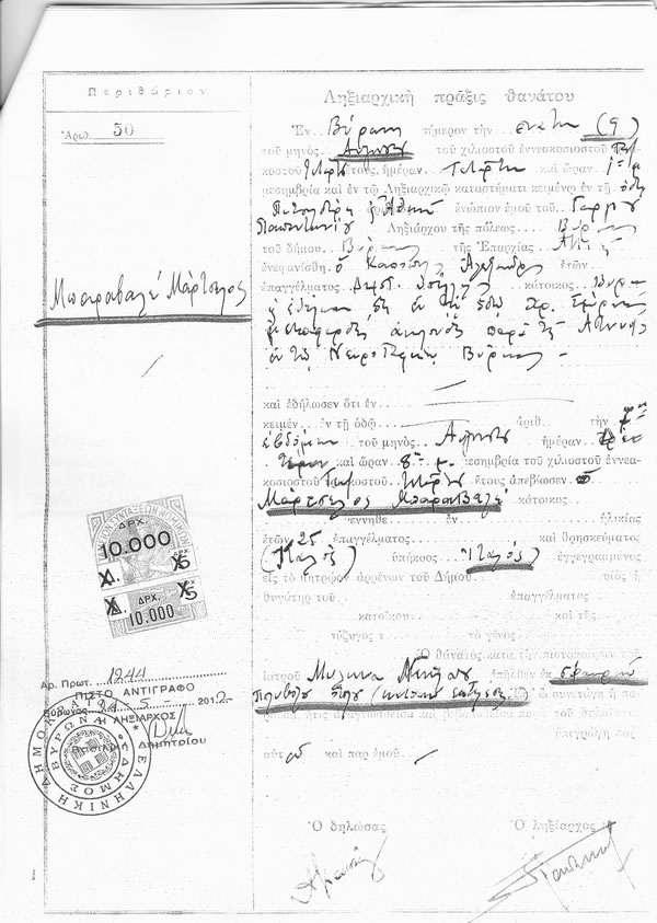 Πάντως, για όποιον αμφιβάλει τα ληξιαρχικά βιβλία του Δ.Β. είναι στη διάθεσή του. Παραθέτουμε την ληξιαρχική πράξη θανάτου η οποία είναι πανομοιότυπη με τις άλλες έντεκα.