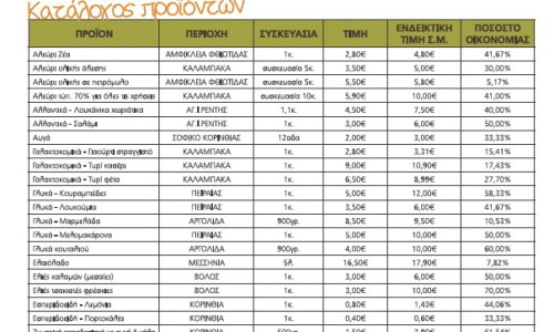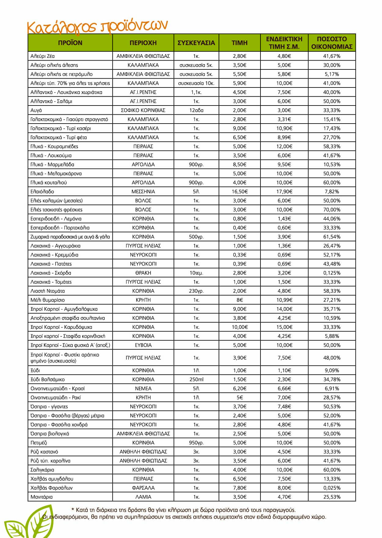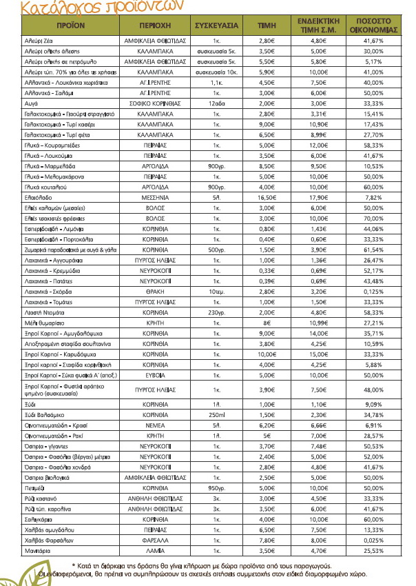 Ενδεικτικά, τα προς διάθεση προϊόντα είναι: αλεύρι, αλλαντικά, αυγά, γαλακτοκομικά, γλυκά, ελαιόλαδο, ελιές, εσπεριδοειδή, ζυμαρικά, λαχανικά, μέλι, τομάτες, ξηροί καρποί, ξύδι, οινοπνευματώδη, όσπρια, ρύζι, σαλιγκάρια, χαλβάς, μανιτάρια κ.α.