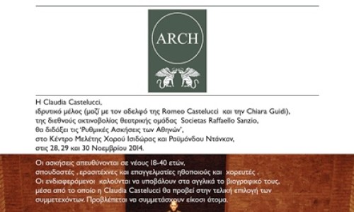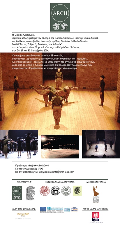 Η Claudia Castellucci έχει προσκληθεί στην Αθήνα από το Ερευνητικό Πρόγραμμα ARCH-ArchivalResearchandCulturalHeritage: TheTheatreArchiveofRomeoCastellucciandSocìetasRaffaelloSanzio, το οποίο υλοποιείται στο πλαίσιο της Ευρωπαϊκής Δράσης «Αριστεία ΙΙ» από το Πανεπιστήμιο Αθηνών και άλλα συνεργαζόμενα ιδρύματα (Πανεπιστήμιο Κρήτης, Πανεπιστήμιο Πελοποννήσου, Αριστοτέλειο Πανεπιστήμιο Θεσσαλονίκης, Ακαδημία Αθηνών), με επιστημονική υπεύθυνη την καθηγήτρια ¶ννα Ταμπάκη.