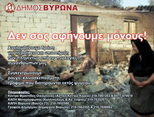 Ο Δήμος Βύρωνα συμπαραστέκεται ενεργά στους συνανθρώπους μας που επλήγησαν από τις πρόσφατες πυρκαγιές. Με σύνθημα αλλά και τρόπο σκέψης το «Δεν σας αφήνουμε μόνους», αναλαμβάνουμε δράση και συγκεντρώνουμε: Ρούχα, κλινοσκεπάσματα και τρόφιμα που μπορούν να διατηρηθούν εκτός ψυγείου. Σας περιμένουμε να δείξετε έμπρακτα τη συμπαράστασή σας.