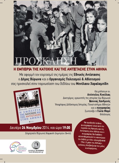 Τη Δευτέρα 24 Νοεμβρίου και ώρα 19.00, θα παρουσιασθεί στο Δημαρχείο του Δήμου Βύρωνα, το βιβλίο του Μενέλαου Χαραλαμπίδη “Η εμπειρία της κατοχής και της αντίστασης στην Αθήνα”, με αφορμή τον εορτασμό της ημέρας της Εθνικής Αντίστασης.Θα μιλήσουν ο Απόστολος Κοκόλιας, Δικηγόρος και ερευνητής της ιστορίας του Βύρωνα, ο Ιάσονας Χανδρινός, Υποψήφιος Διδάκτορας Ιστορίας του Πανεπιστημίου Αθηνών και ο Συγγραφέας .
