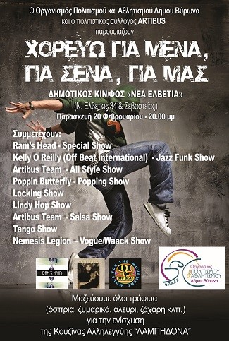 Ο πολιτιστικός σύλλογος ARTIBUS σε συνεργασία με τον Οργανισμό Πολιτισμού και Αθλητισμού Δήμου Βύρωνα και παρουσιάζει την παράσταση ΧΟΡΕΥΩ ΓΙΑ ΜΕΝΑ, ΓΙΑ ΣΕΝΑ, ΓΙΑ ΜΑΣ.