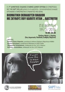 Ο 2ος Δημοτικός Παιδικός Σταθμός Δήμου Βύρωνα σε συνεργασία με την "SAPT Hellas" (Δράση για τα Αδέσποτα – Σκύλοι θεραπείας Ελλάδος) οργανώνει επιμορφωτική συνάντηση με θέμα: "Βιωματική εκπαίδευση παιδιών με σκύλους που κάποτε ήταν … αδέσποτοι"