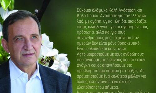 Ανάσταση για τον ελληνικό λαό, με αγάπη, ελπίδα, αισιοδοξία, πίστη, αλληλεγγύη, για τα αγαπημένα μας πρόσωπα, αλλά και για τους συνανθρώπους μας. Το μήνυμα των ημερών δεν είναι μόνο θρησκευτικό. Είναι πολιτικό και κοινωνικό. Ας το μοιραστούμε με τους ανθρώπους που αγαπάμε, με εκείνους που το έχουν ανάγκη και ας απαντήσουμε στα προβλήματα του σήμερα με πράξεις. Ας οραματιστούμε ένα καλύτερο μέλλον για όλους, εκπονώντας ένα σχέδιο υλοποίησης του σήμερα. Η επιτυχία του είναι και δική μας υπόθεση.