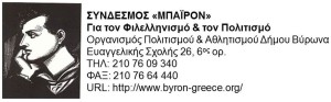 - τη Δευτέρα 20 Απριλίου, 2015 και ώρα 12.00 το μεσημέρι, σε συνεργασία με τον Δήμο Βύρωνα,στην κεντρική πλατεία του Βύρωνα στον Αγ. Λάζαρο, θα πραγματοποιηθεί εκδήλωση τιμής στα 191 χρόνια από τον θάνατο του Λόρδου Βύρωνα, και την ΗΜΕΡΑ ΦΙΛΕΛΛΗΝΙΣΜΟΥ και ΔΙΕΘΝΟΥΣ ΑΛΛΗΛΕΓΓΥΗΣ.