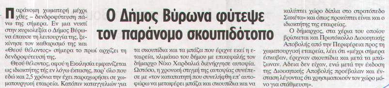 Τέλος στην παρανομία στο χώρο δίπλα στο στρατόπεδο Σακέτα, έδωσε σήμερα Τρίτη, 20 Νοεμβρίου, η Δημοτική Αρχή στο Βύρωνα. Τις τελευταίες ημέρες, μετά από μεγάλο αριθμό καταγγελιών και κατόπιν αυτοψίας κλιμακίου του Δήμου με επικεφαλής το Δήμαρχο Βύρωνα Νίκο Χαρδαλιά, ο «καταπατητής» συνελήφθη επ’ αυτοφώρω να μεταφέρει και να καλύπτει μπάζα και σκουπίδια στο χώρο δίπλα στο στρατόπεδο του Σακέτα.