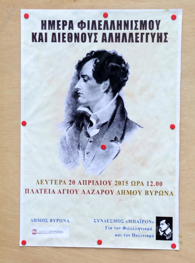 Τη Δευτέρα 20 Απριλίου 2015, σε εκδήλωση που οργανώθηκε - με πολύ μεγάλη επιτυχία -από το Σύνδεσμο «Μπάιρον» σε συνεργασία με τον Δήμο Βύρωνα, ο Δήμαρχος της πόλης Γρηγόρης Κατωπόδης παρευρέθηκε στην πλατεία του Αγ. Λαζάρου, ώστε να τιμήσει «την κορυφαία προσωπικότητα του φιλελληνισμού, τον Λόρδο Μπάιρον», όπως ανέφερε σχετικά στο λόγο που εκφώνησε και φυσικά την Ημέρα Φιλελληνισμού και Διεθνούς Αλληλεγγύης.