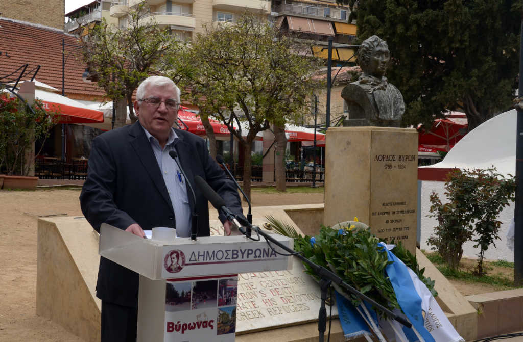 Ο Δήμαρχος Βύρωνα, αναφέρθηκε επίσης στον «σπουδαίο ρόλο που διαδραμάτισε ο Λόρδος Μπάιρον, ώστε να γίνουν γνωσόά το δίκαιο των αιτημάτων των Ελλήνων να ελευθερωθούν και να δημιουργήσουν τη δική τους πατρίδα», θυμίζοντας ότι «από τον αγωνιστή της ελευθερίας και των ανθρωπίνων δικαιωμάτων, δόθηκε το όνομα της πόλης του Βύρωνα το 1924, τότε που ήταν προσφυγικός συνοικισμός».
