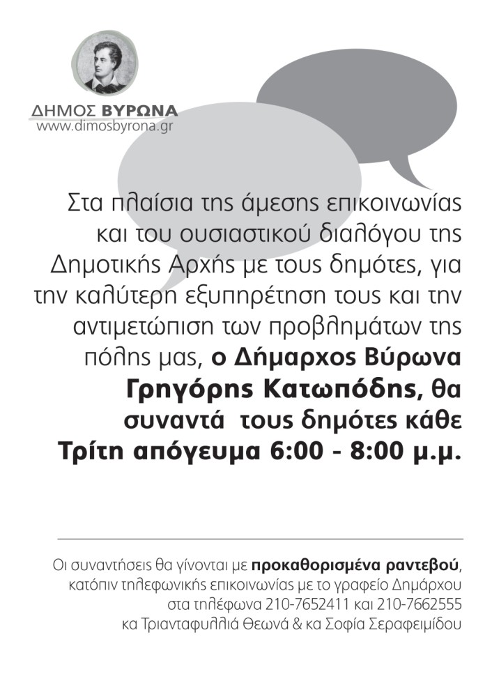 Στο πλαίσιο της άμεσης επικοινωνίας και του ουσιαστικού διαλόγου της Δημοτικής Αρχής με τους δημότες, για την καλύτερη εξυπηρέτηση τους και την αντιμετώπιση των προβλημάτων της πόλης μας, ο Δήμαρχος Βύρωνα Γρηγόρης Κατωπόδης, θα συναντά τους δημότες κάθε Τρίτη απόγευμα 6:00 - 8:00 μ.μ.