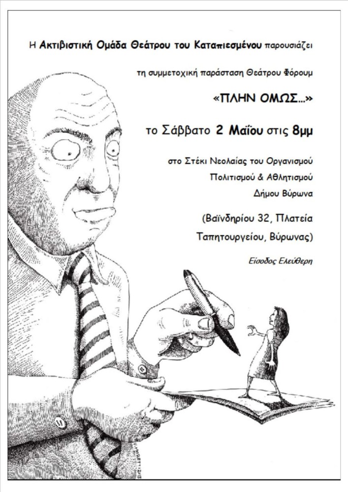 Το Σάββατο 2 Μαΐου στις 20.00 στο "Στέκι Νεολαίας" του Οργανισμού Πολιτισμού & Αθλητισμού Δήμου Βύρωνα, Βαϊνδηρίου 32, Πλατεία Εθνικής αντίστασης (Ταπητουργείο), η Ακτιβιστική Ομάδα Θεάτρου του Καταπιεσμένου (ΘτΚ) παρουσιάζει τη:
