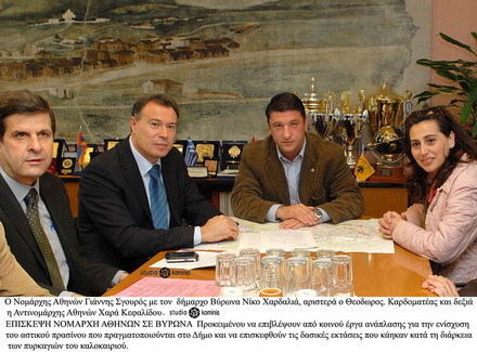 Σε πολύ ζεστό και φιλικό κλίμα έγινε η επίσκεψη του Νομάρχη Αθηνών Γιάννη Σγουρού, την Πέμπτη 22 Νοεμβρίου, στο Δήμο Βύρωνα. Ο Νομάρχης Αθηνών, επέβλεψε μαζί με το Δήμαρχο Βύρωνα Νίκο Χαρδαλιά, έργα ανάπλασης και διαμόρφωσης κοινόχρηστων χώρων για την ενίσχυση του αστικού πρασίνου στην περιοχή.