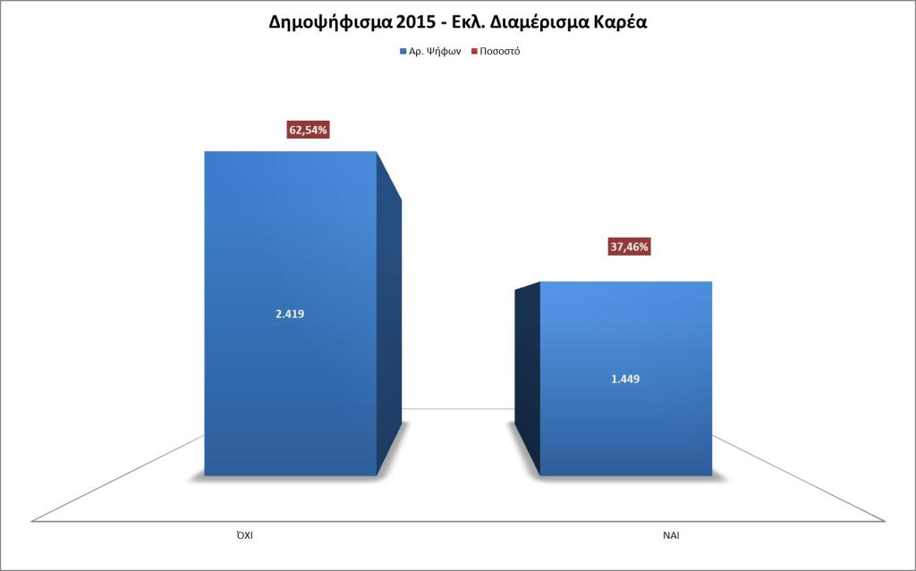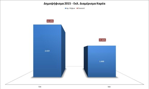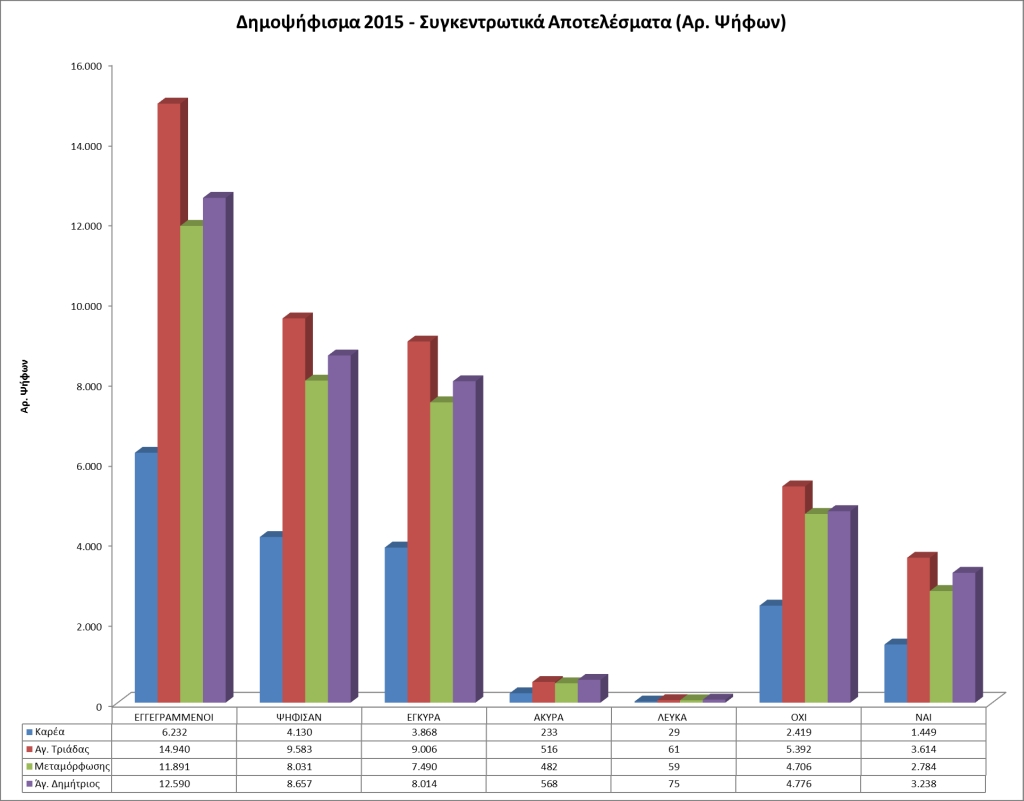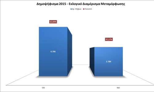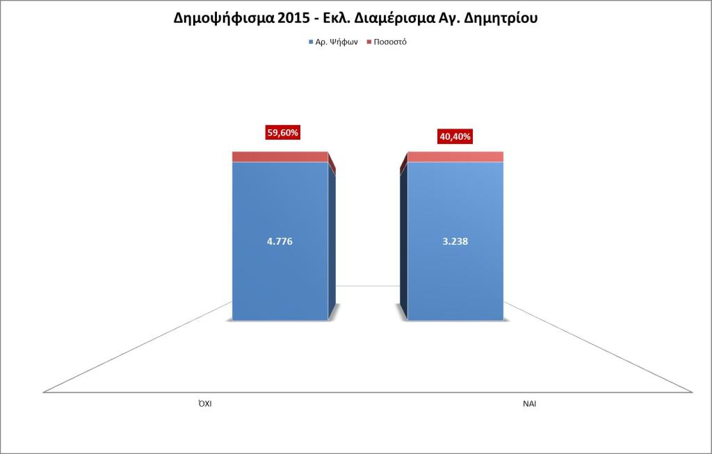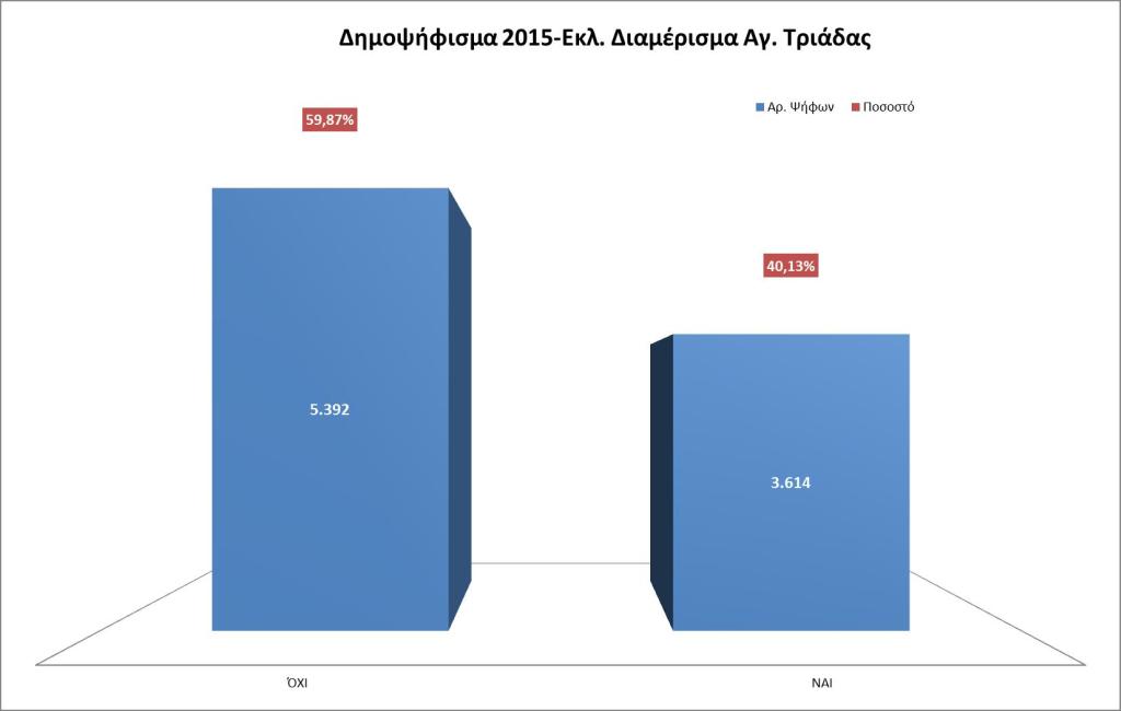 Οι περιοχές που το ΟΧΙ εμφανίζει τα μεγαλύτερα ποσοστά είναι ο Νομός Χανίων (73,77%), η Β΄ Εκλογική Περιφέρεια Πειραιά (72,51%), οι νομοί Κέρκυρας, Ηρακλείου (70,82%), Σάμου (70,31%), Αχαΐας (68,44%), Ξάνθης (67,89%), Ευβοίας (67,60%), Βοιωτίας (67,43%) και Ζακύνθου (67,31%).