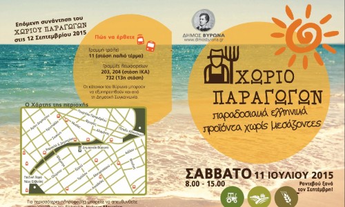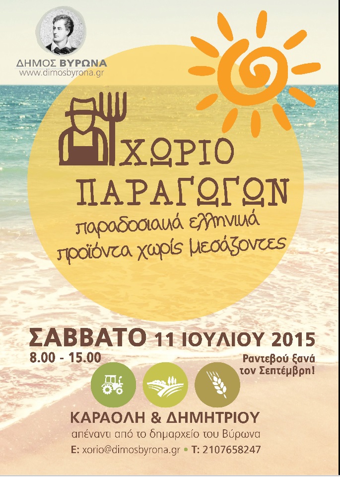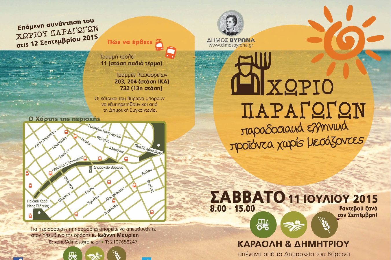 Το Σάββατο 11 Ιουλίου, στο Πάρκο της Καραολή & Δημητρίου απέναντι από το Δημαρχείο, θα διεξαχθεί η κοινωνική δράση “Χωριό Παραγωγών”, που διοργανώνεται από τον Δήμο Βύρωνα, με ώρες λειτουργίας 08.00 – 15.00.