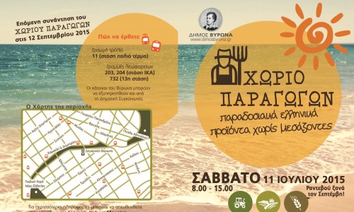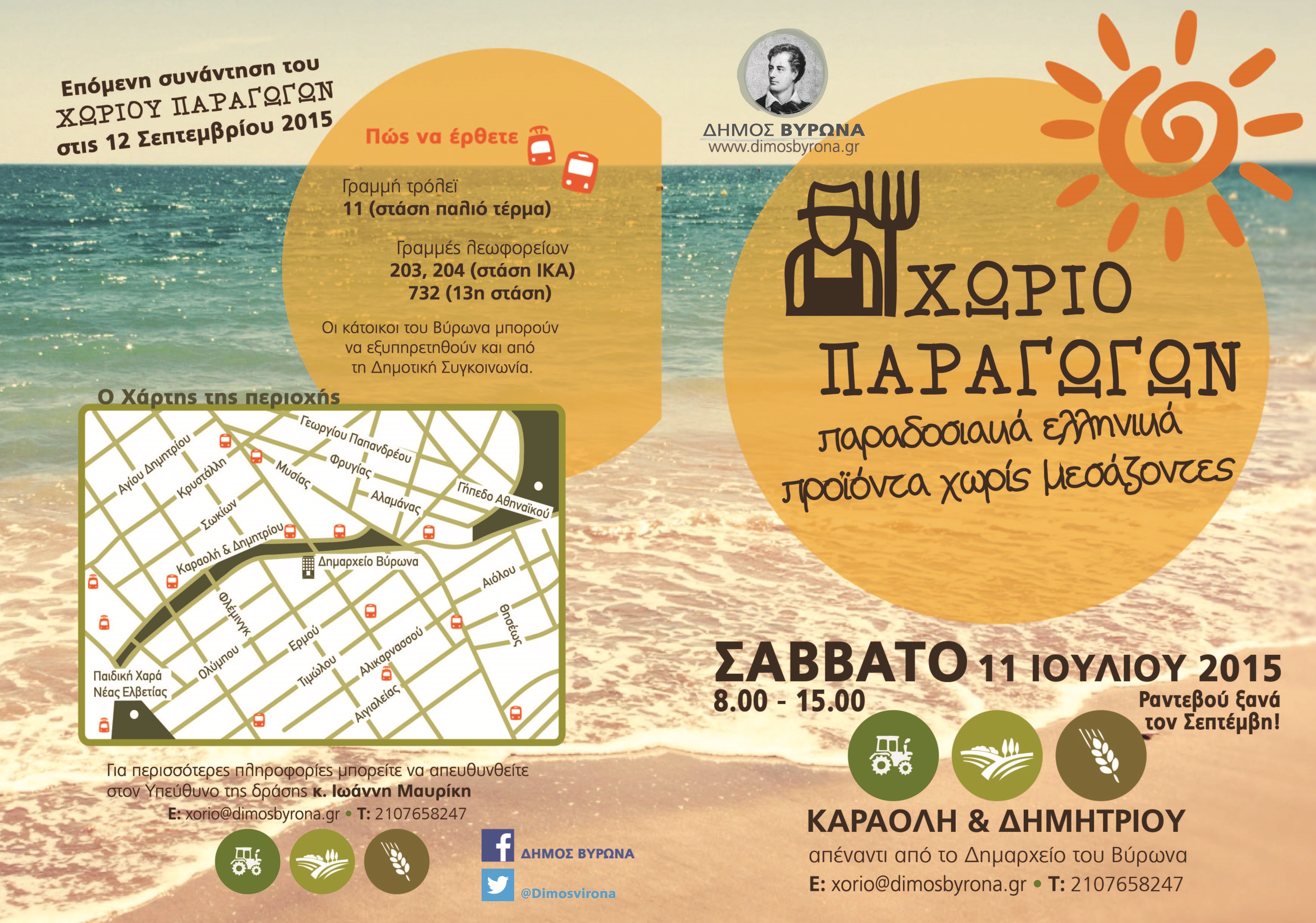 Το Σάββατο 11 Ιουλίου, στο Πάρκο της Καραολή & Δημητρίου απέναντι από το Δημαρχείο, θα διεξαχθεί η κοινωνική δράση “Χωριό Παραγωγών”, που διοργανώνεται από τον Δήμο Βύρωνα, με ώρες λειτουργίας 08.00 – 15.00.