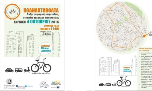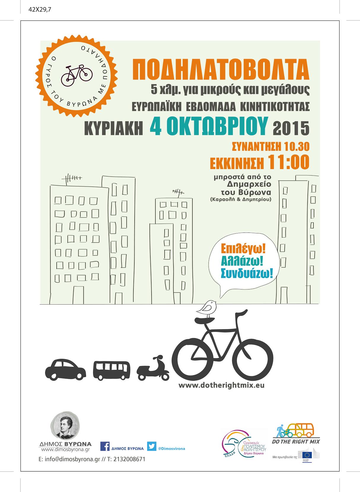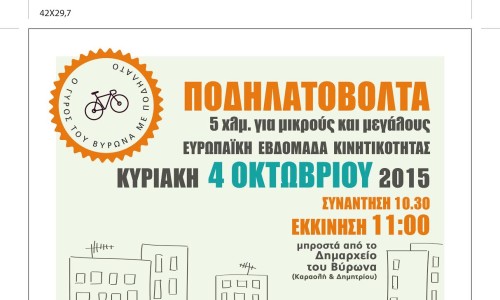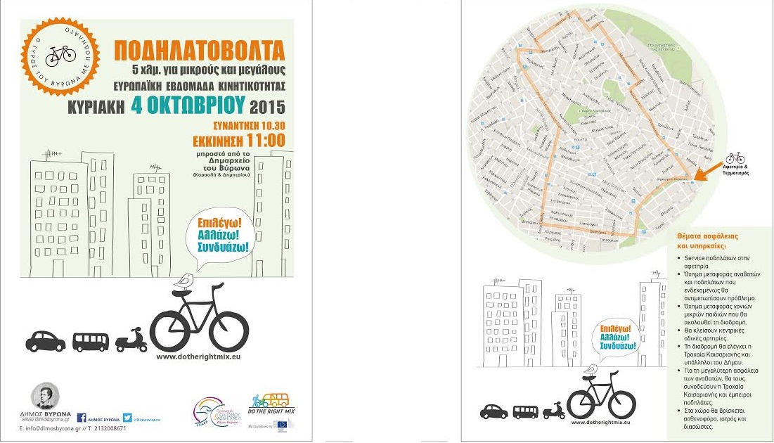 Ο Δήμος Βύρωνα, στα πλαίσια της συγκεκριμένης δράσης διοργανώνει (εκπρόθεσμα δυστυχώς λόγω εκλογών), ποδηλατοβόλτα την Κυριακή 4 Οκτωβρίου, με τόπο συνάντησης την Καραολή & Δημητρίου, μπροστά από το Δημαρχείο.
