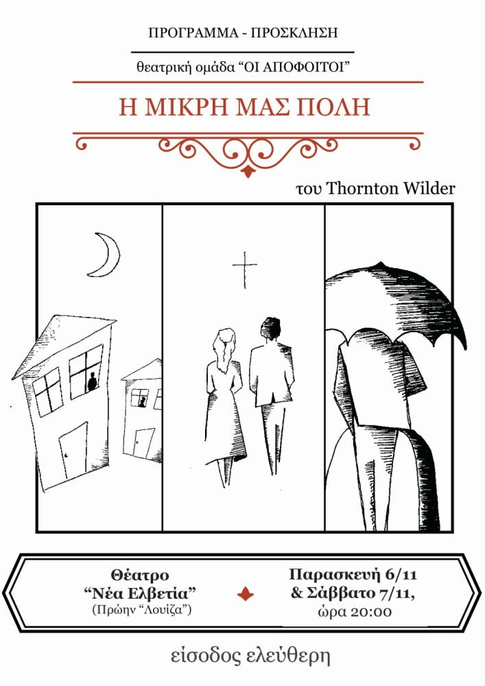 Η Θεατρική Ομάδα «Απόφοιτοι» παρουσιάζουν την Παρασκευή 6 και το Σάββατο 7 Νοεμβρίου στον Δημοτικό Κινηματοθέατρο «Νέα Ελβετία» (πρώην Λουίζα ), Ν. Ελβετίας 34, στις 20:00, την παράσταση "Η μικρή μας πόλη" του Θόρντον Ουάιλντερ.