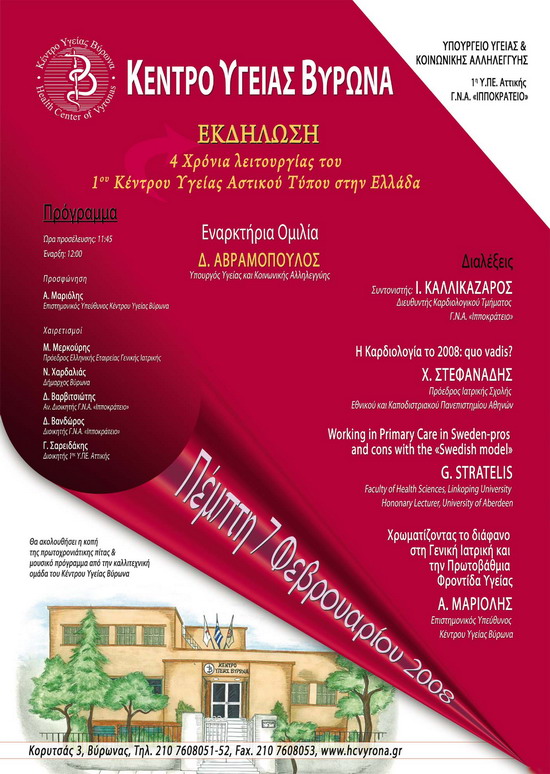 Στις 7 Φεβρουαρίου, στις 10:30 π.μ θα πραγματοποιηθεί η εκδήλωση για τα "γενέθλια" του Κέντρου Υγείας Βύρωνα, που αρχικώς ήταν προγραμματισμένη για τις 30/01/08.