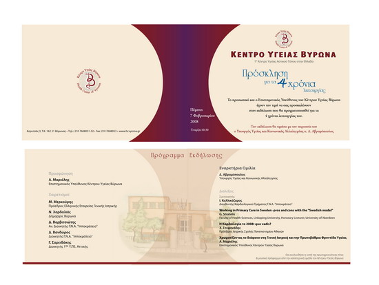 Το προσωπικό και ο Επιστημονικός Υπεύθυνος του Κέντρου Υγείας Βύρωνα, Ανάργυρος Μαριόλης, σας προσκαλούν στην εκδήλωση που θα πραγματοποιηθεί με αφορμή τη συμπλήρωση 4 ετών λειτουργίας, του Πρώτου Κέντρου Υγείας Αστικού Τύπου στην Ελλάδα, με επίσημο προσκεκλημένο τον Υπουργό Υγείας και Κοινωνικής Αλληλεγγύης, Δημήτρη Αβραμόπουλο.
