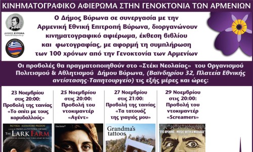 Ο Δήμος Βύρωνα, σε συνεργασία με την Αρμενική Εθνική Επιτροπή Βύρωνα, διοργανώνουν κινηματογραφικό αφιέρωμα, έκθεση βιβλίου και φωτογραφίας, με αφορμή τη συμπλήρωση των 100 χρόνων από τη Γενοκτονία των Αρμενίων.