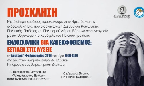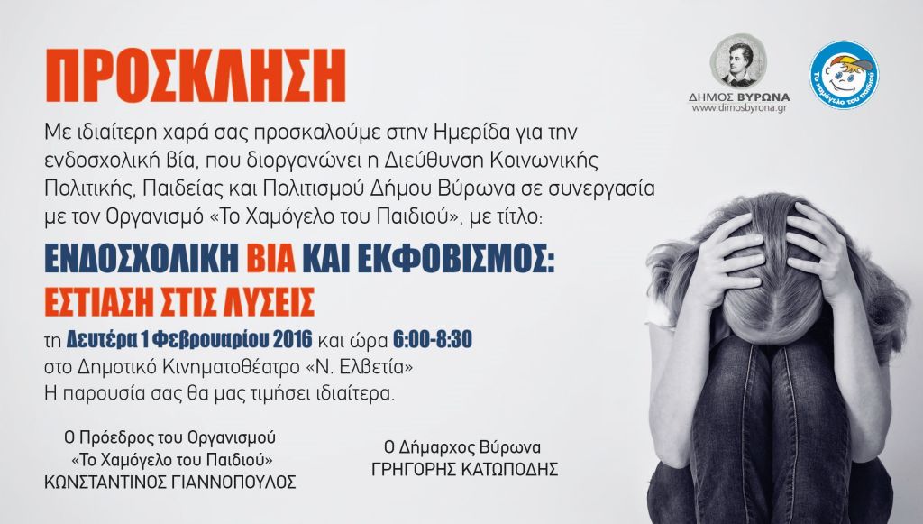 Ημερίδα: «Ενδοσχολική Βία Και Εκφοβισμός: Εστίαση στις Λύσεις», 1/2/2016, 6:00μ.μ, στο Δημοτικό Κινηματοθέατρο «Νέα Ελβετία» (πρώην Λουίζα)
