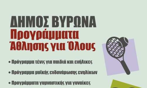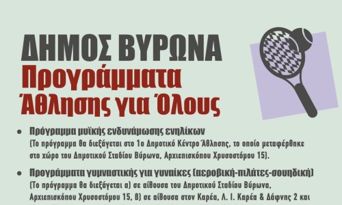 Το πρόγραμμα θα διεξάγεται στο 1ο Δημοτικό Κέντρο ¶θλησης, το οποίο μεταφέρθηκε στο χώρο του Δημοτικού Σταδίου Βύρωνα, Αρχιεπισκόπου Χρυσοστόμου 15.