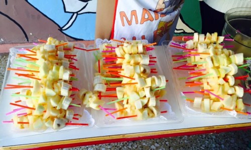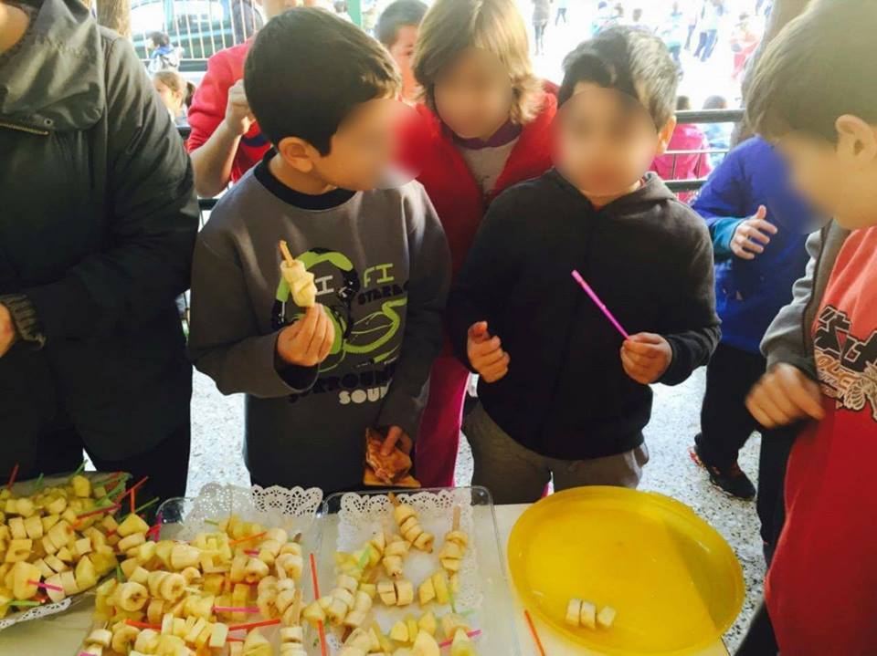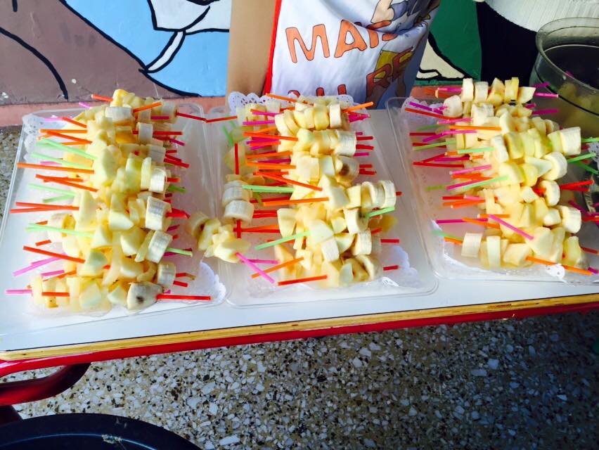 Έτσι ξεκινήσαμε με φρεσκοστυμμένο χυμό πορτοκαλιού, συνεχίσαμε με σουβλάκια από φρούτα ενώ την άλλη εβδομάδα θα προσφέρουμε ζελεδάκια με φρέσκα φρούτα.