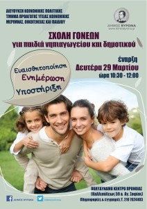 Ο Β΄ Κύκλος για τους γονείς των παιδιών που φοιτούν στον 3ο, 6ο, 7ο, 8ο, 9ο, 10ο, παιδικό σταθμό ξεκινά την Τρίτη 15 Μαρτίου 2016 και ώρα 10:30-12:00 στο Πολυδύναμο Κέντρο Πρόνοιας Δήμου Βύρωνα (Καλλιπόλεως 59 & Αγ.Σοφίας).