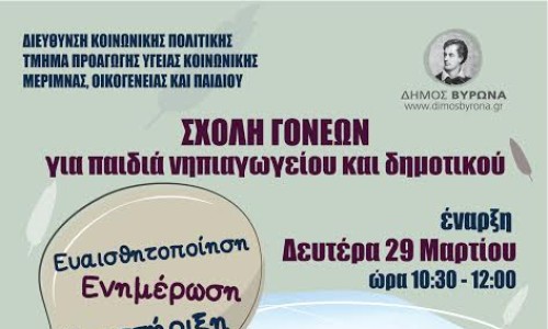 Με το θέμα της αυτοεκτίμησης και των καλών πρακτικών ενδυνάμωσης των παιδιών προσχολικής ηλικίας, ολοκληρώθηκε ο Α΄ Κύκλος του προγράμματος των Σχολών Γονέων που διοργάνωσε η Διεύθυνση Κοινωνικής Πολιτικής Παιδείας & Πολιτισμού σε συνεργασία με το Νομικό Πρόσωπο των Παιδικών σταθμών Δήμου Βύρωνα.
