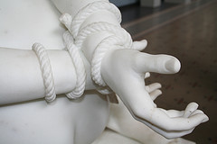 με δεμένα πάλι τα χέρια, αιχμάλωτη.