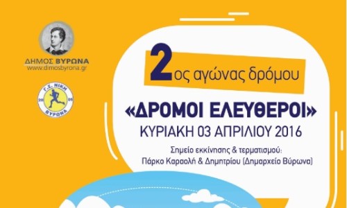 Ο Δήμος Βύρωνα διοργανώνει για δεύτερη φορά μια αθλητική εκδήλωση που τείνει να γίνει θεσμός. Ο λόγος για τον 2ο αγώνα δρόμου με την ονομασία "ΔΡΟΜΟΙ ΕΛΕΥΘΕΡΟΙ", που θα διεξαχθεί την Κυριακή 3 Απριλίου 2016. Σημείο εκκίνησης και τερματισμού το πάρκο της Καραολή & Δημητρίου (Δημαρχείο).