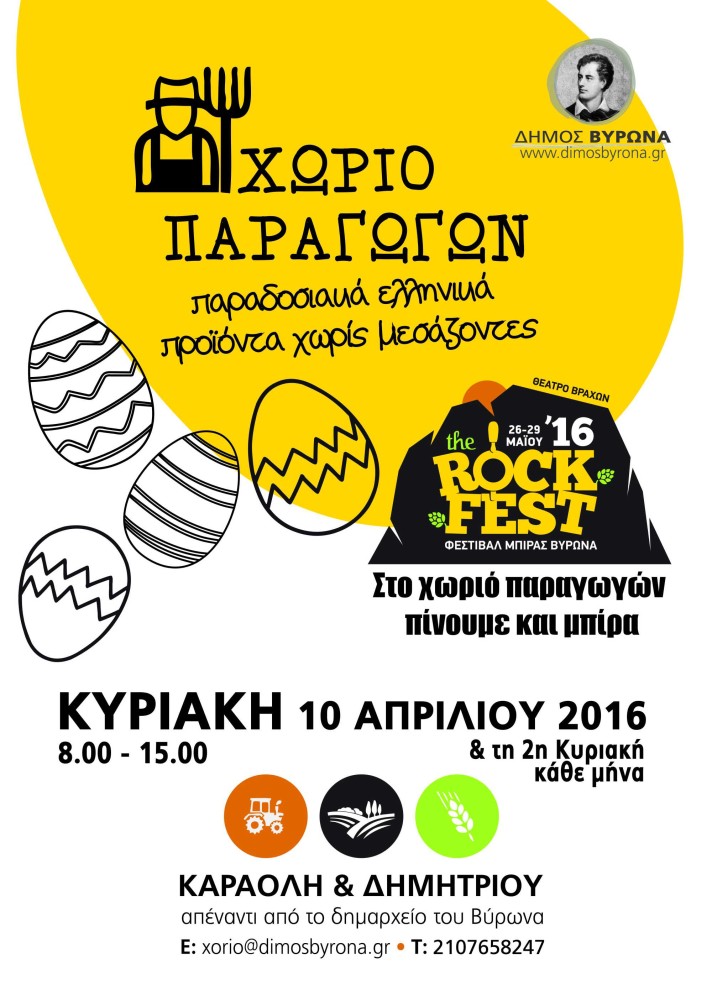 * Το Χωριό Παραγωγών συναντάει το Φεστιβάλ Μπίρας (The Rock Fest 2016) που θα διοργανώσει ο Δήμος Βύρωνα με πρωτοβουλία της Δημοτικής Επιχείρησης και Ανάπτυξης, από 26 έως 29 Μαΐου στο Θέατρο Βράχων. Ο Δήμος Βύρωνα, ο οποίος είναι ήδη γνωστός σε όλο το Λεκανοπέδιο για το «Χωριό Παραγωγών» που οργανώνει κάθε μήνα με ελληνικά αγροτικά προϊόντα, θέλει με την πρωτοβουλία αυτή να βοηθήσει και να αναδείξει τις ελληνικές μικροζυθοποιίες και τα προϊόντα τους.