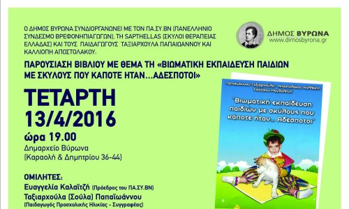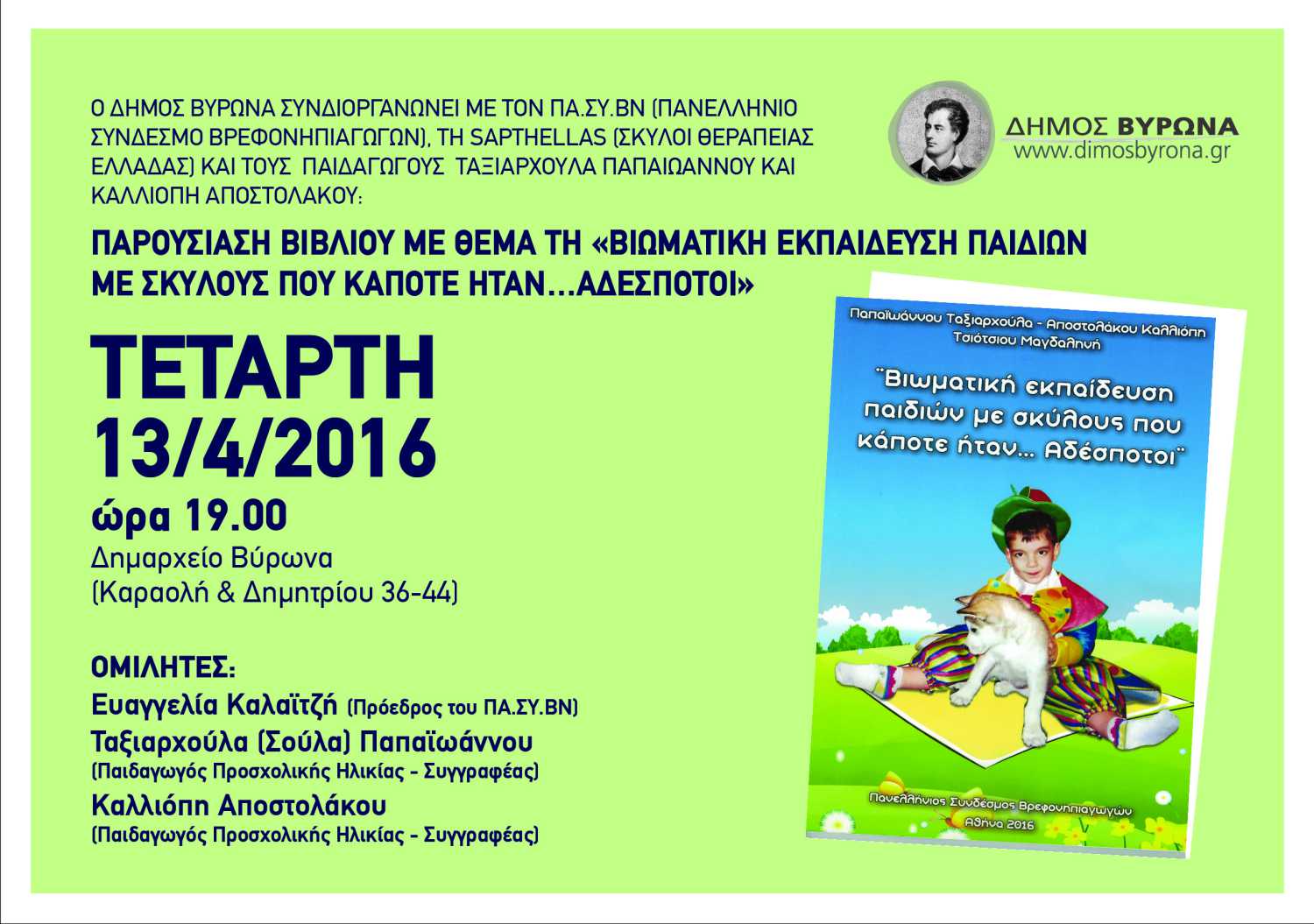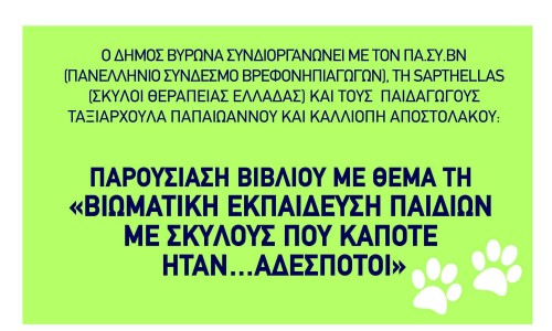 Την Τετάρτη 13 Απριλίου 2016 και ώρα 19.00, στο Δημαρχείο Βύρωνα (Καραολή & Δημητρίου 36-44) ο Δήμος Βύρωνα συνδιοργανώνει με τον ΠΑ.ΣΥ.ΒΝ (ΠΑΝΕΛΛΗΝΙΟ ΣΥΝΔΕΣΜΟ ΒΡEΦΟΝΗΠΙΑΓΩΓΩΝ), τη SAPTHellas (ΣΚΥΛΟΙ ΘΕΡΑΠΕΙΑΣ ΕΛΛΑΔΑΣ) και τους παιδαγωγούς Ταξιαρχούλα Παπαιωάννου και Καλλιόπη Αποστολάκου: Παρουσίαση βιβλίου με θέμα τη "Βιωματική εκπαίδευση παιδιών με σκύλους που κάποτε ήταν…Αδέσποτοι".