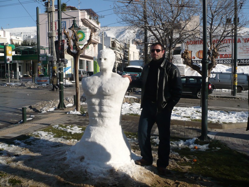 Το μεσημέρι της Δευτέρας, 18 Φεβρουαρίου, μια παρέα νεαρών διασκέδαζε με το χιόνι στο Βύρωνα. Στο πάρκο της Καραολή & Δημητρίου, έφτιαξαν έναν ανδριάντα από χιόνι... Στη φωτογραφία το έργο τέχνης και ο δημιουργός του...