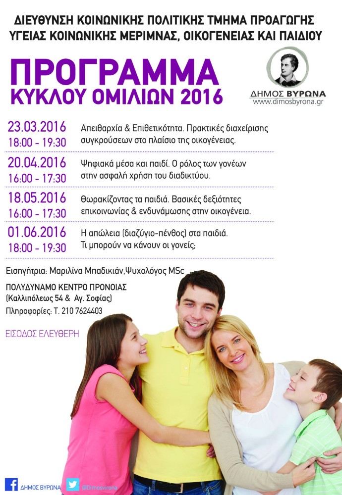 Η ομιλία θα πραγματοποιηθεί την Τετάρτη 1 Ιουνίου, ώρα 6:00-7:30 στο χώρο του Πολυδύναμου Κέντρου Πρόνοιας Δήμου Βύρωνα, (Καλλιπόλεως 59 & Αγ.Σοφίας τ. 210-7624403).