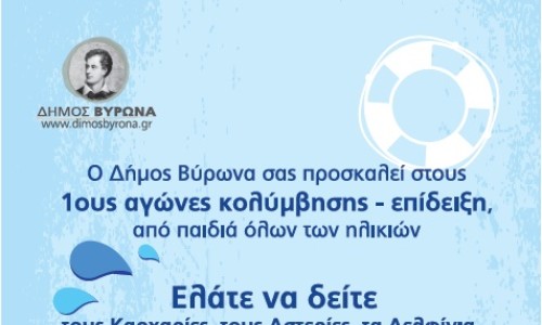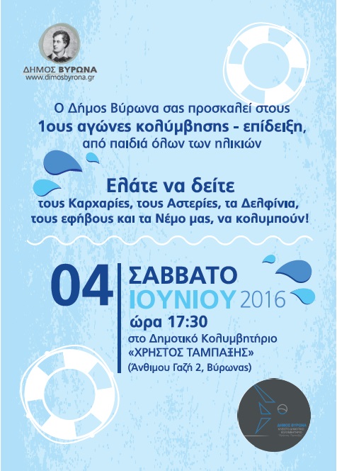 Ενόψει της συμπλήρωσης τριών (3) μηνών λειτουργίας του Κολυμβητηρίου, ο Δήμος Βύρωνα διοργανώνει τους 1ους Αγώνες Κολύμβησης – Επίδειξη όλων των τμημάτων (παιδιών και ενηλίκων) το Σάββατο 4 Ιουνίου 2016 και ώρα 17.30, στο Δημοτικό Κολυμβητήριο «Χρήστος Ταμπαξής» (¶νθιμου Γαζή 2, Βύρωνας).