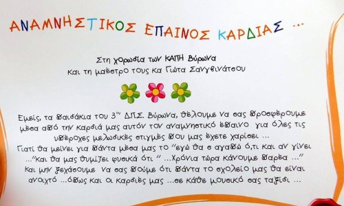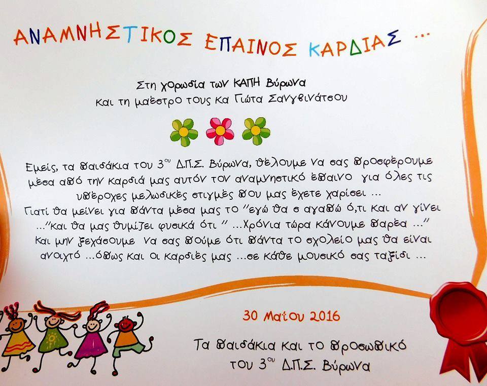 Η μεγάλη συγκίνηση για τα μέλη της χορωδίας των Κ.Α.Π.Η ήταν ο έγγραφος ΕΠΑΙΝΟΣ που προσφέρθηκε στο τέλος της εκδήλωσης από τη διευθύντρια και τα παιδάκια του σταθμού, περιγράφοντας με λίγες λέξεις την αγάπη τους, αφήνοντας τη ζεστή αγκαλιά τους ανοιχτή για το επόμενο μουσικό ταξίδι!