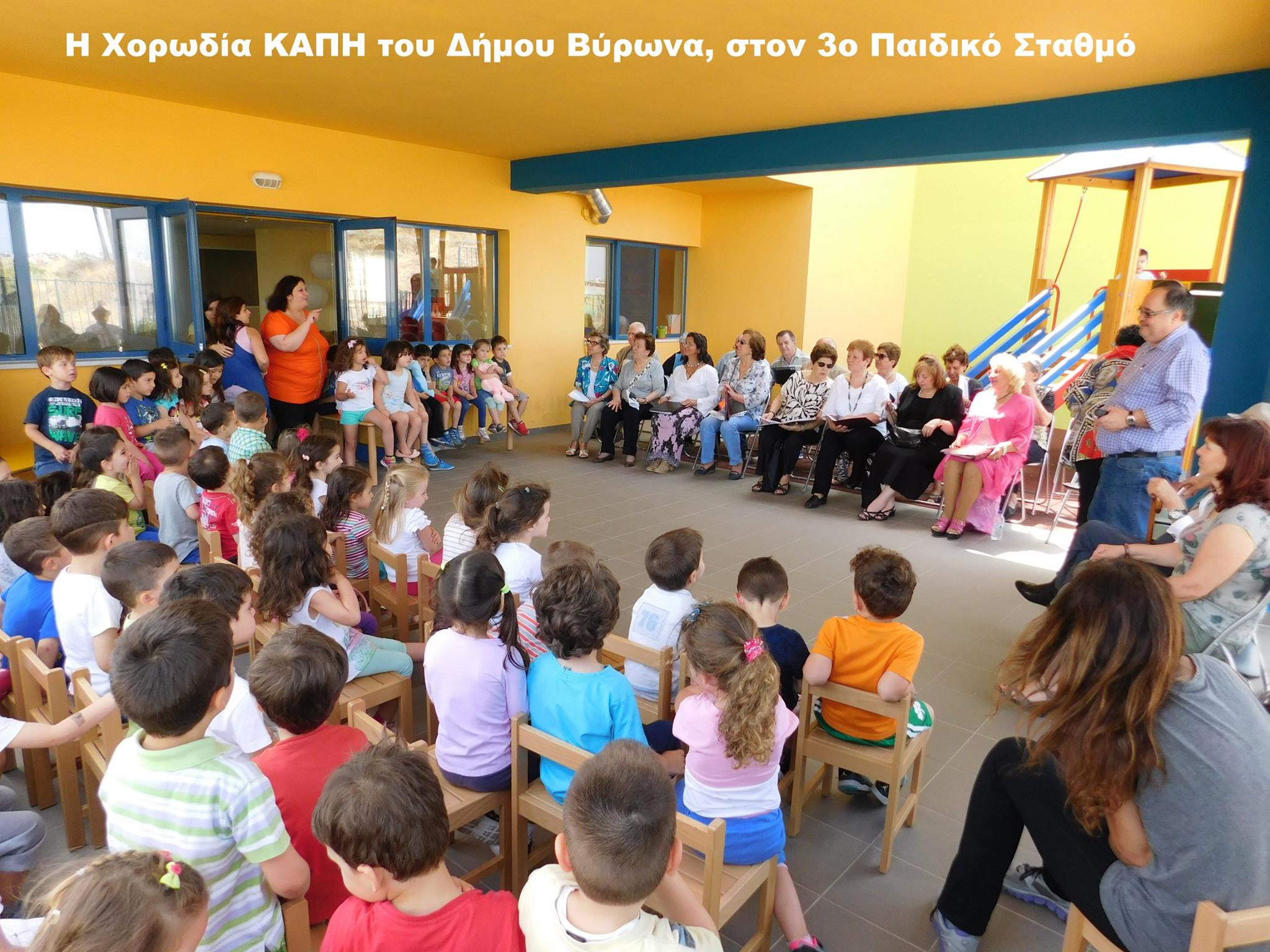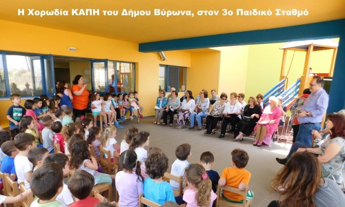 Ο 3ος Δημοτικός Παιδικός Σταθμός Βύρωνα με τη Διευθύντριά του Μαρία Βολάκη, υποδέχθηκε τους παππούδες και τις γιαγιάδες της Χορωδίας των Κ.Α.Π.Η. Δήμου Βύρωνα που συνοδεύονταν από το δημοτικό υπάλληλο και εργοθεραπευτή των Κ.Α.Π.Η Γιώργο Κουτεντάκη , η οποία απέδωσε τρίφωνα διασκευασμένα παραδοσιακά τραγούδια, για την Επέτειο της Αλωσης της Κωνσταντινούπολης , υπό τη διεύθυνση της Παναγιώτας Σανγβινάτσου.