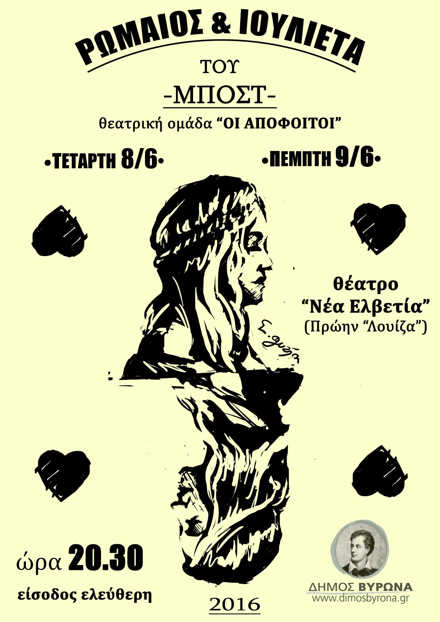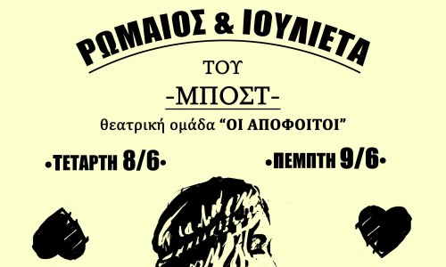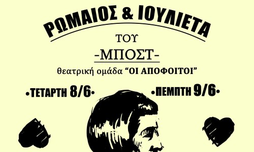 Η θεατρική ομάδα «Οι Απόφοιτοι» παρουσιάζει το έργο «ΡΩΜΑΙΟΣ & ΙΟΥΛΙΕΤΑ» του ΜΠΟΣΤ, την Τετάρτη 8 και την Πέμπτη 9 Ιουνίου 2016, στον Δημοτικό Κινηματογράφο «Νέα Ελβετία» (Ν. Ελβετίας 34) στις 20.30.