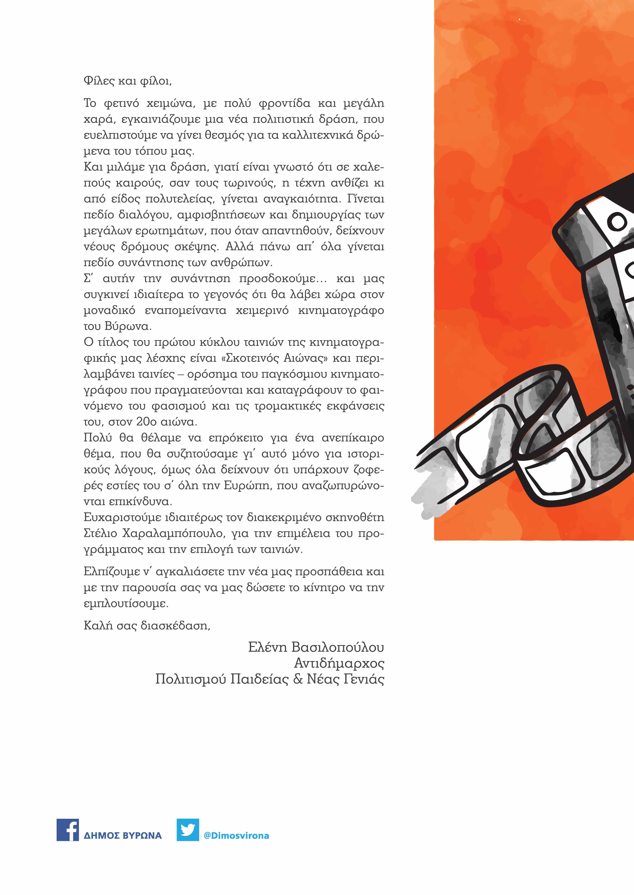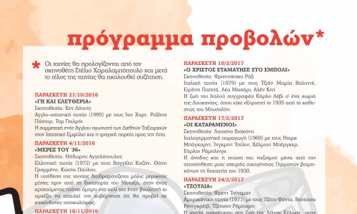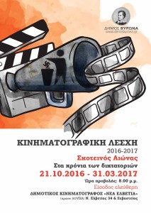 Ο κύκλος ταινιών της φετινής περιόδου, από 21/10/2016 – & 07/04/2017, έχει τίτλο «Σκοτεινός Αιώνας – Στα χρόνια των δικτατοριών» και είναι αφιερωμένος «σε ταινίες/ορόσημα που αποτύπωσαν με ενάργεια το φασιστικό φαινόμενο και ταυτόχρονα, σε μορφικό επίπεδο, άφησαν ένα διακριτό ίχνος στο χώρο της 7ης Τέχνης» όπως χαρακτηριστικά αναφέρει στο σημείωμα του ο διακεκριμένος σκηνοθέτης Στέλιος Χαραλαμπόπουλος, που ευγενικά προσφέρθηκε να επιμεληθεί το φετινό μας πρόγραμμα και να επιλέξει τις ταινίες που ο ίδιος θα προλογίζει στον Δημοτικό Κινηματογράφο «Νέα Ελβετία» (πρώην Λουΐζα), που θα προβάλλονται.