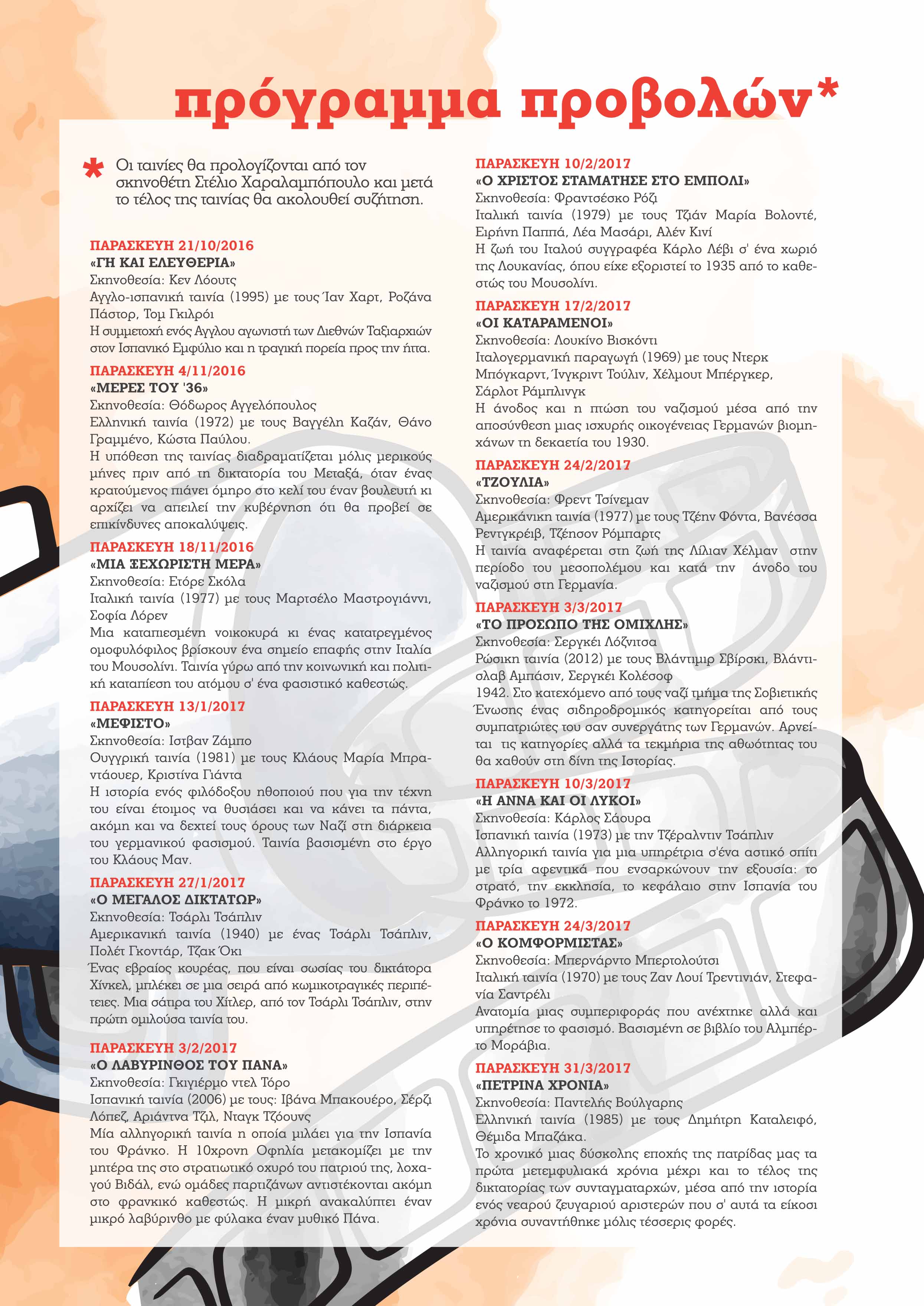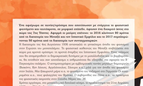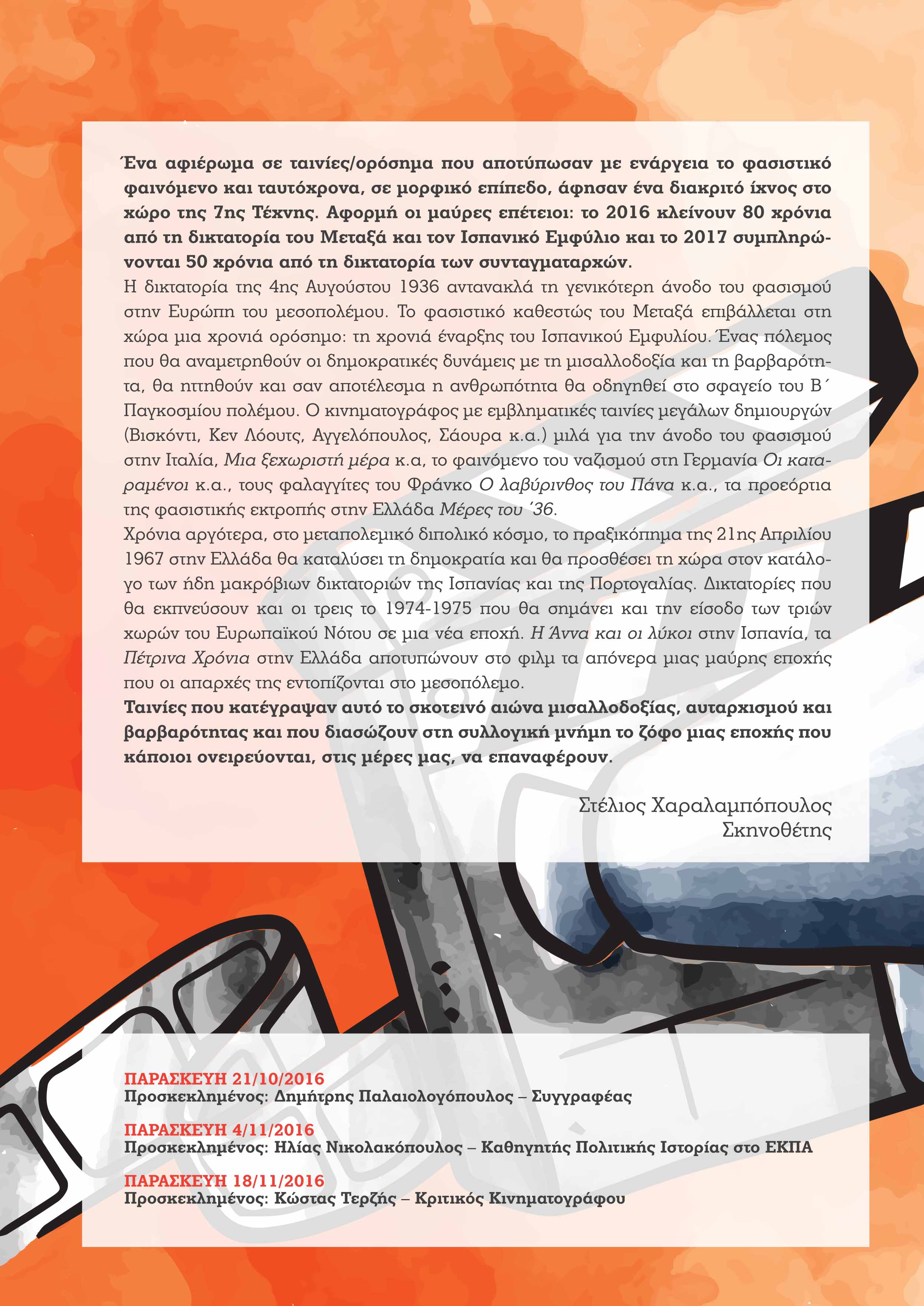 Ένα αφιέρωμα σε ταινίες/ορόσημα που αποτύπωσαν με ενάργεια το φασιστικό φαινόμενο και ταυτόχρονα, σε μορφικό επίπεδο, άφησαν ένα διακριτό ίχνος στο χώρο της 7ης Τέχνης. Αφορμή οι μαύρες επέτειοι: το 2016 κλείνουν 80 χρόνια από τη δικτατορία του Μεταξά και τον Ισπανικό Εμφύλιο και το 2017 συμπληρώνονται 50 χρόνια από τη δικτατορία των συνταγματαρχών.