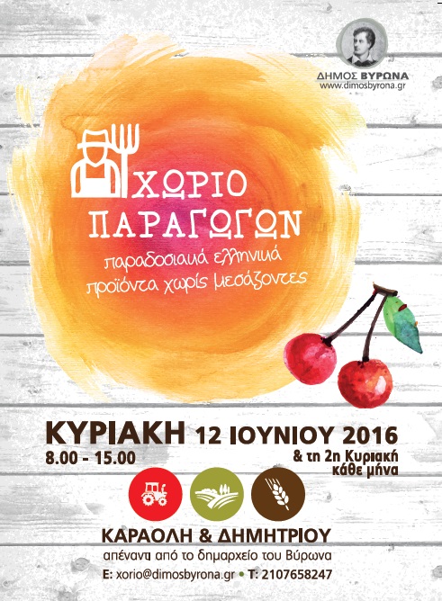 ![]() Την Κυριακή 12 Ιουνίου 2016, στο πάρκο της Καραολή & Δημητρίου απέναντι από το Δημαρχείο, θα διεξαχθεί η κοινωνική δράση “Χωριό Παραγωγών”, που διοργανώνεται από τον Δήμο Βύρωνα με ώρες λειτουργίας 08:00 – 15:00. |
