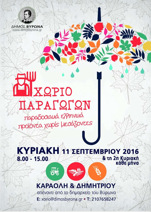 ![]() Την Κυριακή 11 Σεπτεμβρίου 2016, στο πάρκο της Καραολή & Δημητρίου απέναντι από το Δημαρχείο, θα διεξαχθεί η κοινωνική δράση “Χωριό Παραγωγών”, που διοργανώνεται από τον Δήμο Βύρωνα με ώρες λειτουργίας 08:00 – 15:00. |