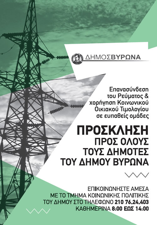 Συστάθηκε στο Δήμο τριμελής επιτροπή αποτελούμενη από έναν εκπρόσωπο της ΔΕΗ, έναν της ΔΕΔΔΗΕ και έναν του Δήμου Βύρωνα με σκοπό την εξέταση των δικαιολογητικών και των προϋποθέσεων ώστε να δίνεται άμεσα η εντολή για επανασύνδεση του ρεύματος και ένταξη στο Κοινωνικό Οικιακό Τιμολόγιο. Ως εκ τούτου, καλούνται οι κάτοικοι του Δήμου Βύρωνα μας να επικοινωνήσουν άμεσα με το Τμήμα Κοινωνικής Πολιτικής του Δήμου στο τηλέφωνο 2107624403 καθημερινά από 8:00 έως 14:00, προκειμένου να ενημερωθούν και να καταγραφούν.