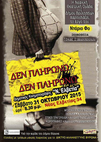 Το "Δίκτυο Αλληλεγγύης Βύρωνα" παρουσιάζει το Σάββατο 31 Οκτωβρίου, στο Δημοτικό κινηματοθέατρο "Νέα Ελβετία" (Λουΐζα), Νέας Ελβετία 34, στις 20:30, την παράσταση «Δεν πληρώνω! Δεν πληρώνω», του Ντάριο Φο, σε σκηνοθεσία και καθοδήγηση της Τόνιας Σταυροπούλου, από τη Νεανική Θεατρική Ομάδα του Δήμου Βριλησσίων . Η παράσταση έχει φιλανθρωπικό χαρακτήρα και δίνεται στα πλαίσια στήριξης του Δικτύου Αλληλεγγύης Βύρωνα, για αυτό στην είσοδο θα αυγκεντρώνονται τρόφιμα μακράς διάρκειας!!