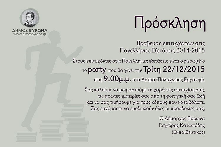 ![]() Ο Δήμαρχος Βύρωνα, στις 22 Δεκεμβρίου, στις 21:00, στον πολυχώρο "¶στρα" θα βραβεύσει τους επιτυχόντες μαθητές των λυκείων της πόλης μας, στις Πανελλήνιες Εξετάσεις 2014 – 2015.