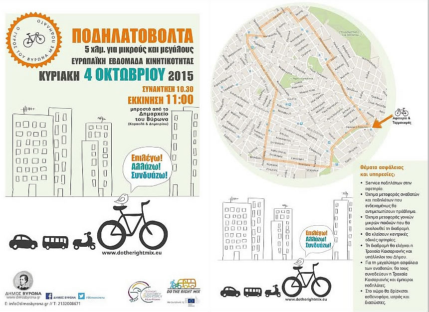 Ο Δήμος Βύρωνα, στα πλαίσια της συγκεκριμένης δράσης διοργανώνει (εκπρόθεσμα δυστυχώς λόγω εκλογών), ποδηλατοβόλτα την Κυριακή 4 Οκτωβρίου, με τόπο συνάντησης την Καραολή & Δημητρίου, μπροστά από το Δημαρχείο. Ώρα προσέλευσης 10.30 π.μ. και ώρα εκκίνησης 11.00 π.μ..